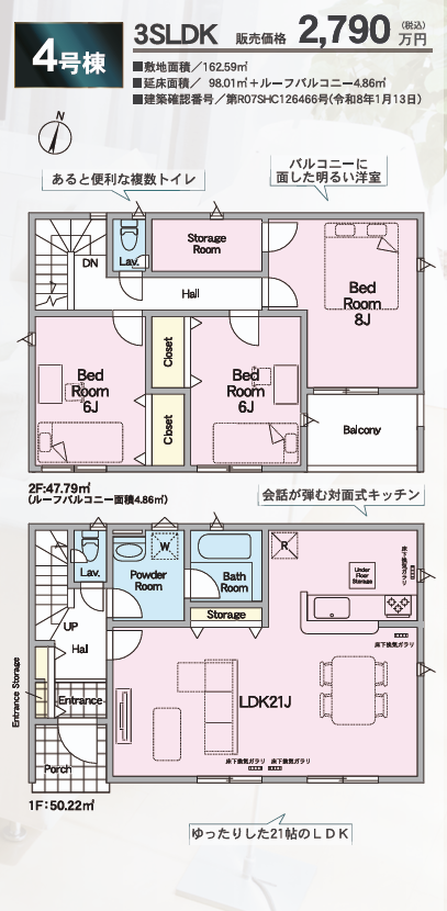 | 建物構造 | 木造在来工法2階建て | 建物面積 | 98.01㎡(29.6坪)+ルーフバルコニー4.86㎡ |