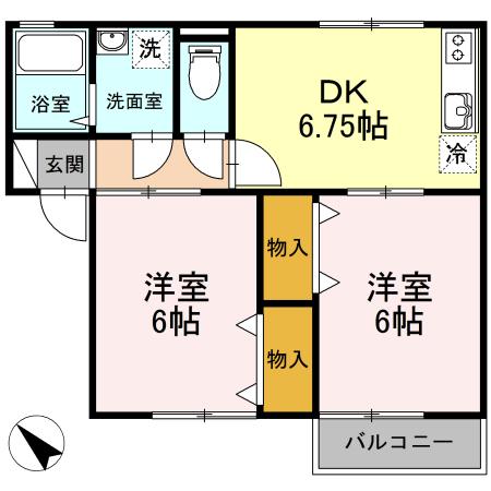 | 間取り | 2DK(DK6.75 洋6 洋6) |