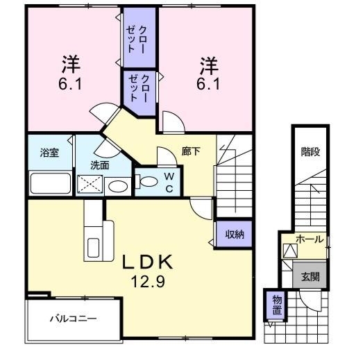 | 間取り | 2LDK(LDK12.9 洋6.1 洋6.1) |