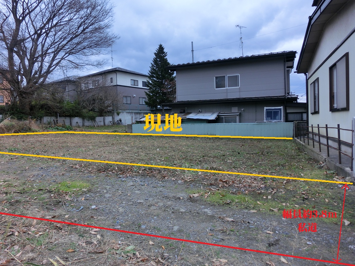 | 接道状況 | 北側、幅員約3.8mの私道(みなし道路)に間口約16mが面する | ||