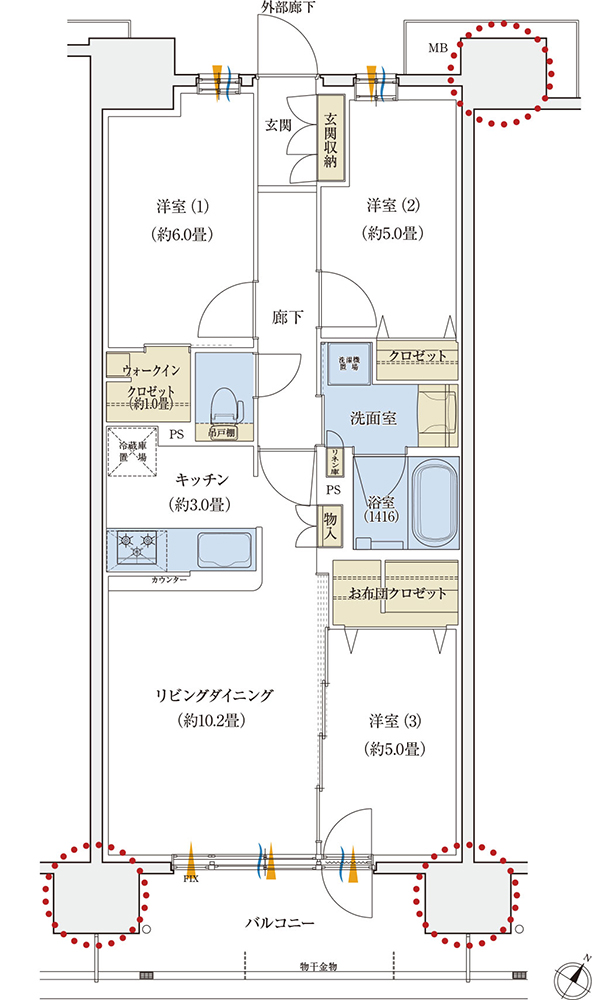 | 間取内訳 | 3LDK LDK10,2帖 洋6帖 洋5帖 洋5帖 バルコニー | ||