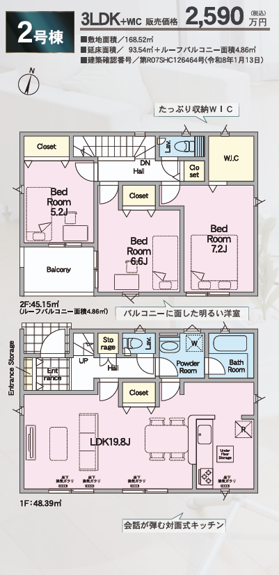 | 建物構造 | 木造在来工法2階建て | 建物面積 | 93.54㎡(29.1坪)+ルーフバルコニー4.86㎡ |